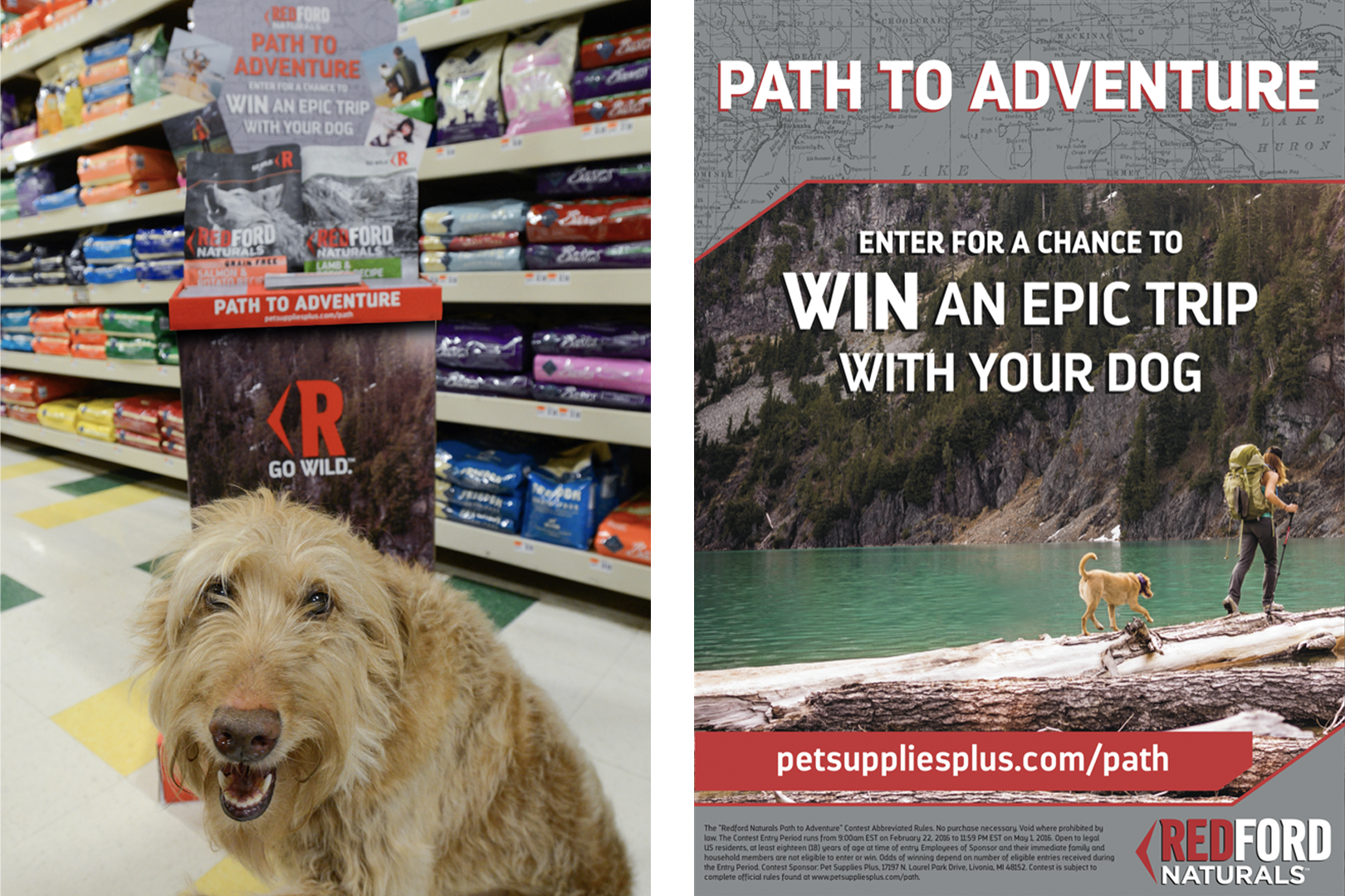 When Pet Supplies Plus introduced their private-label pet food line, Redford Naturals, they needed to clearly communicate its differentiators and build brand adoption— first among retail staff, then with consumers. My team developed the “Path to Adventure” contest, a brand strategy across over 400 stores, which awarded lucky pet parents and their dogs a dream vacation in the wild. We also deployed an influencer outreach program to increase social presence and build relationships with pet-fluencers. Deliverables included print, digital, POP displays, merchandise, and social media.